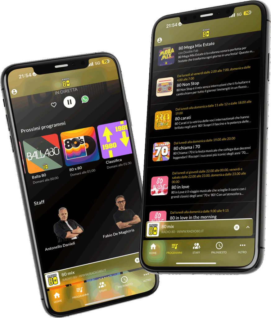 Esplora l’universo di Radio 80 tramite la nostra app! Immergiti nei ritmi indimenticabili degli anni ’80 mentre scopri il palinsesto ricco di successi senza tempo, rivivendo l’epoca d’oro della musica. Scopri gli orari dei programmi e conosci chi, ogni giorno, ti guida attraverso i successi del passato. Ascolta Radio 80 in diretta ovunque ti trovi e lasciati trasportare dai suoni che hanno segnato un’intera generazione. Con Radio 80 viaggi nel tempo: non solo musica ma anche cinema, spot e programmi televisivi!